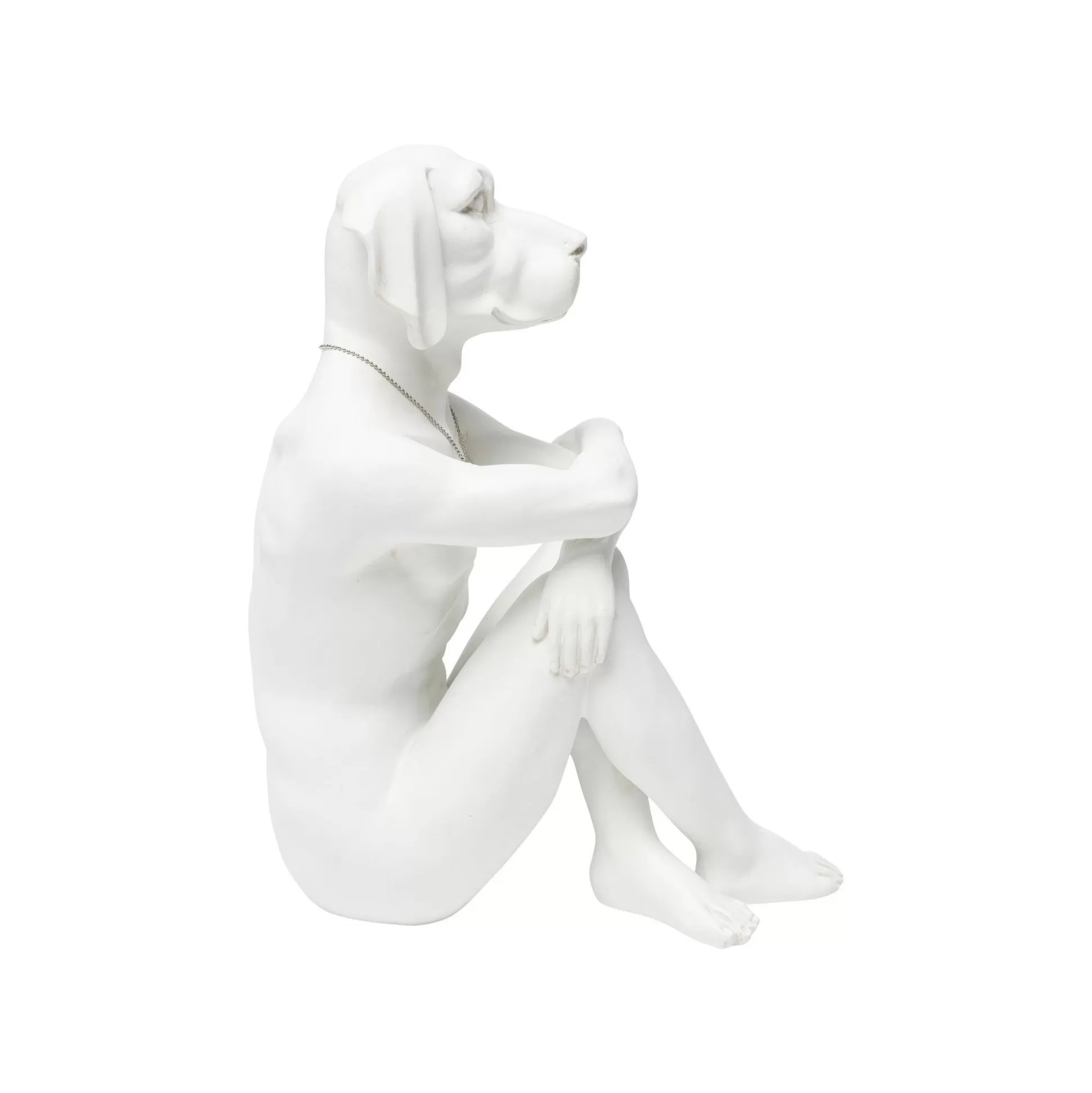 Cette statue représente une tête de chien sur un corps d’homme assis. Elle porte un collier avec des strass argent. Polyrésine blanc cassé avec des zones effet vieilli. Cette décoration a été créée en collaboration avec le couple d’artistes Australiens Gillie et Marc.